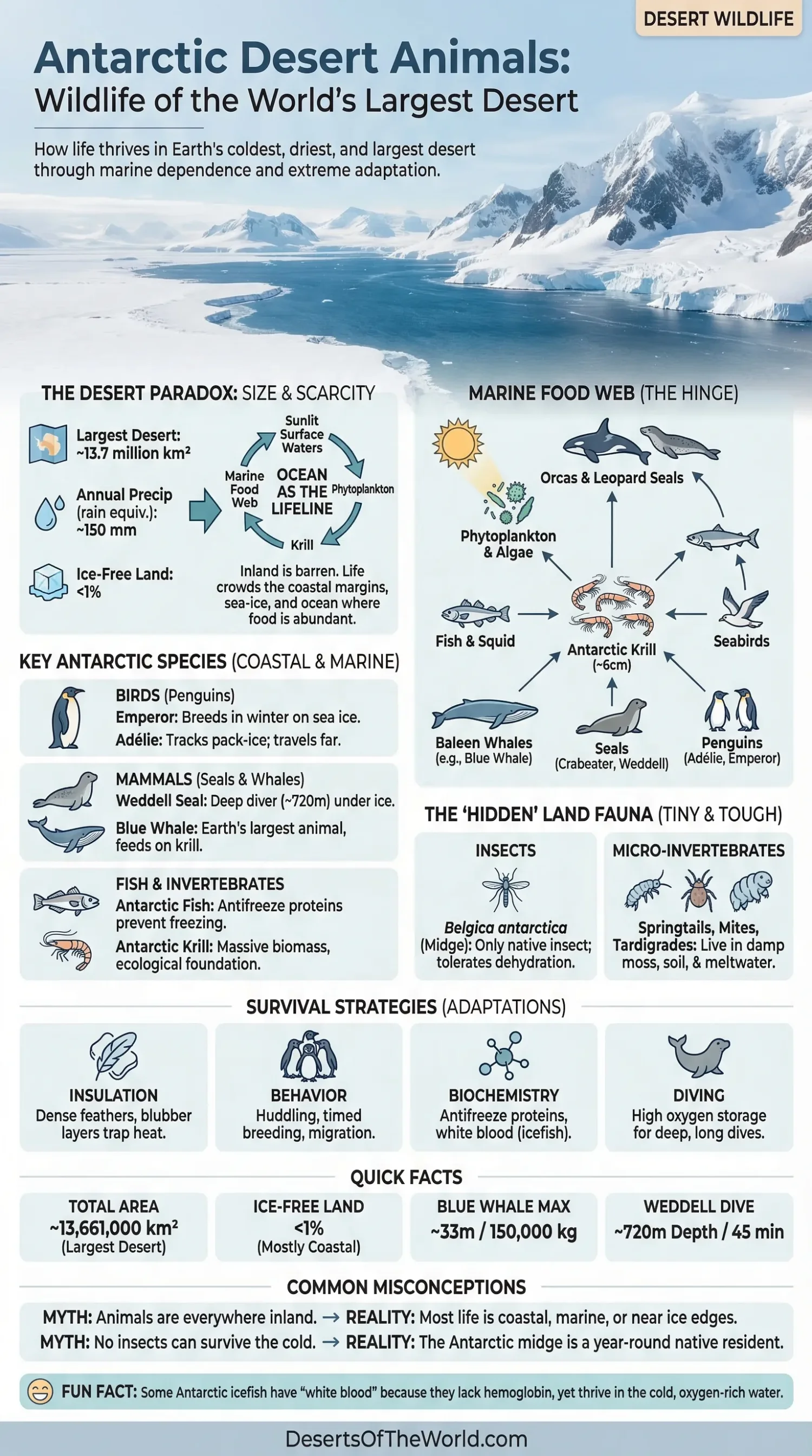 The short answer is simple: the ocean does the feeding. Inland Antarctica is a cold, dry plateau with very little exposed ground, very little liquid water, and almost no room for large land fauna. The coast and the Southern Ocean are different. Sunlit surface waters produce phytoplankton, phytoplankton feeds krill, and krill supports one of the best-known marine food webs on the planet. So when people think about Antarctic desert animals, they are really thinking about animals tied to sea ice, pack ice, fast ice, ice-free shorelines, and nearby ocean water.