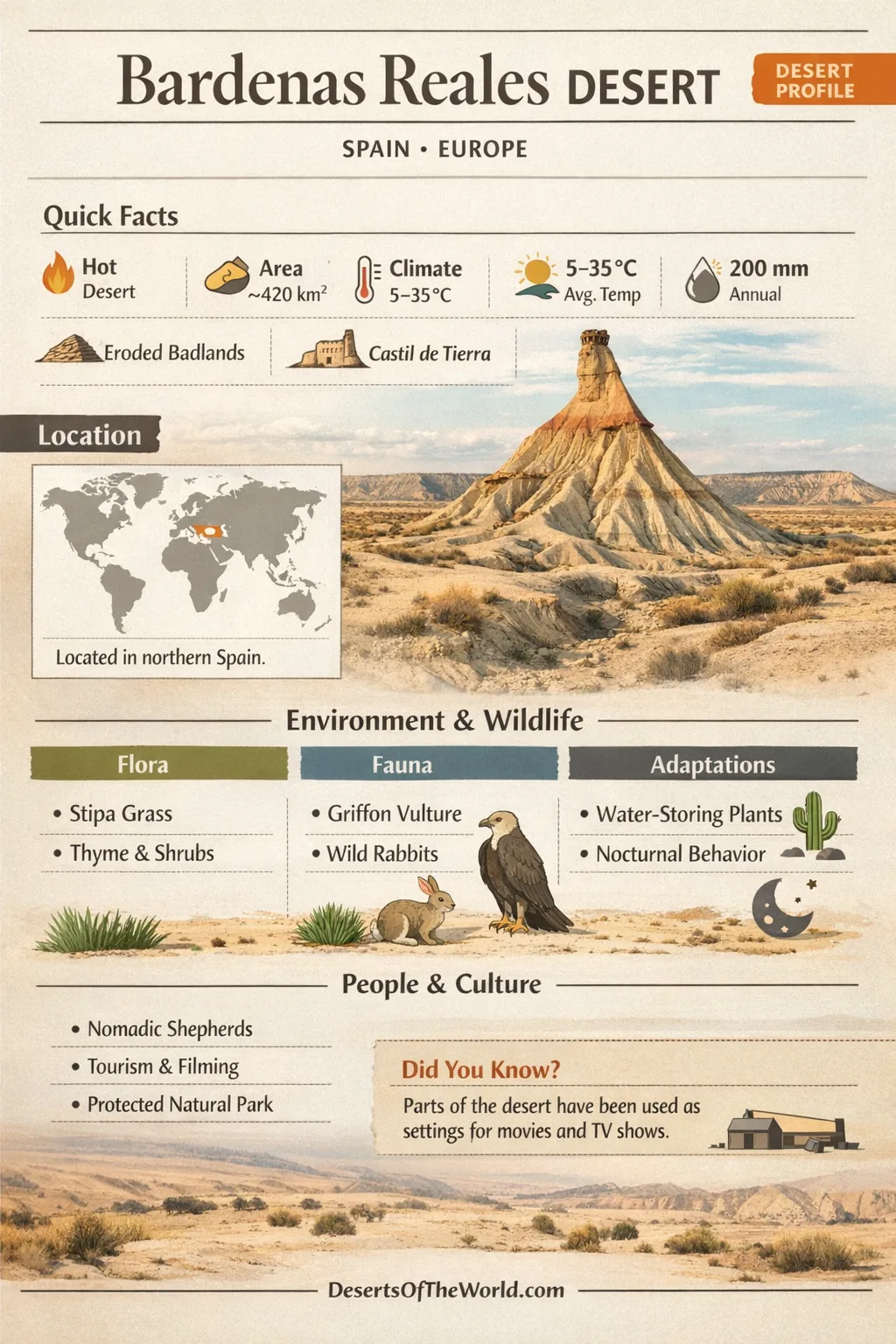 The Bardenas Reales spans approximately 420 square kilometers, showcasing a range of dramatic natural features such as canyons, plateaus, and badlands. The area is characterized by its semi-desert climate, receiving an average annual rainfall of only 300mm. The terrain consists mainly of clay and sandstone, which create surreal formations that resemble a lunar landscape.