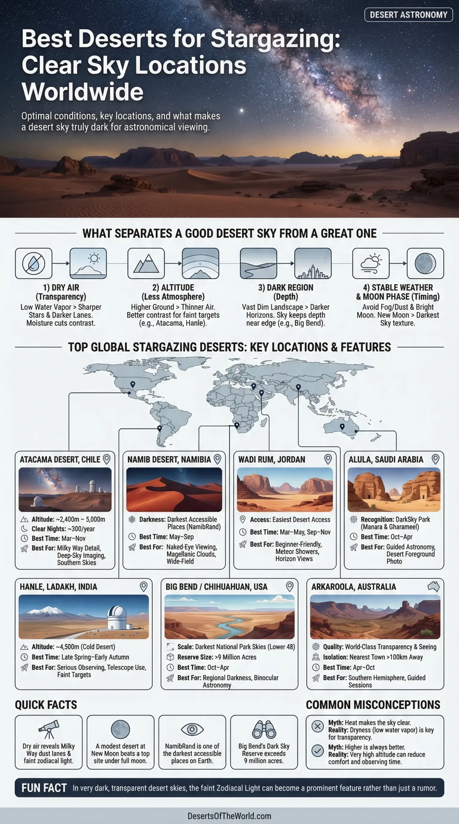 Desert stargazing works best when four things line up: dry air, low light pollution, stable weather, and wide horizons. Sand alone does not make a sky better. A famous dune field can still lose detail to haze, moonlight, or coastal fog. A quieter inland basin can beat it with ease.