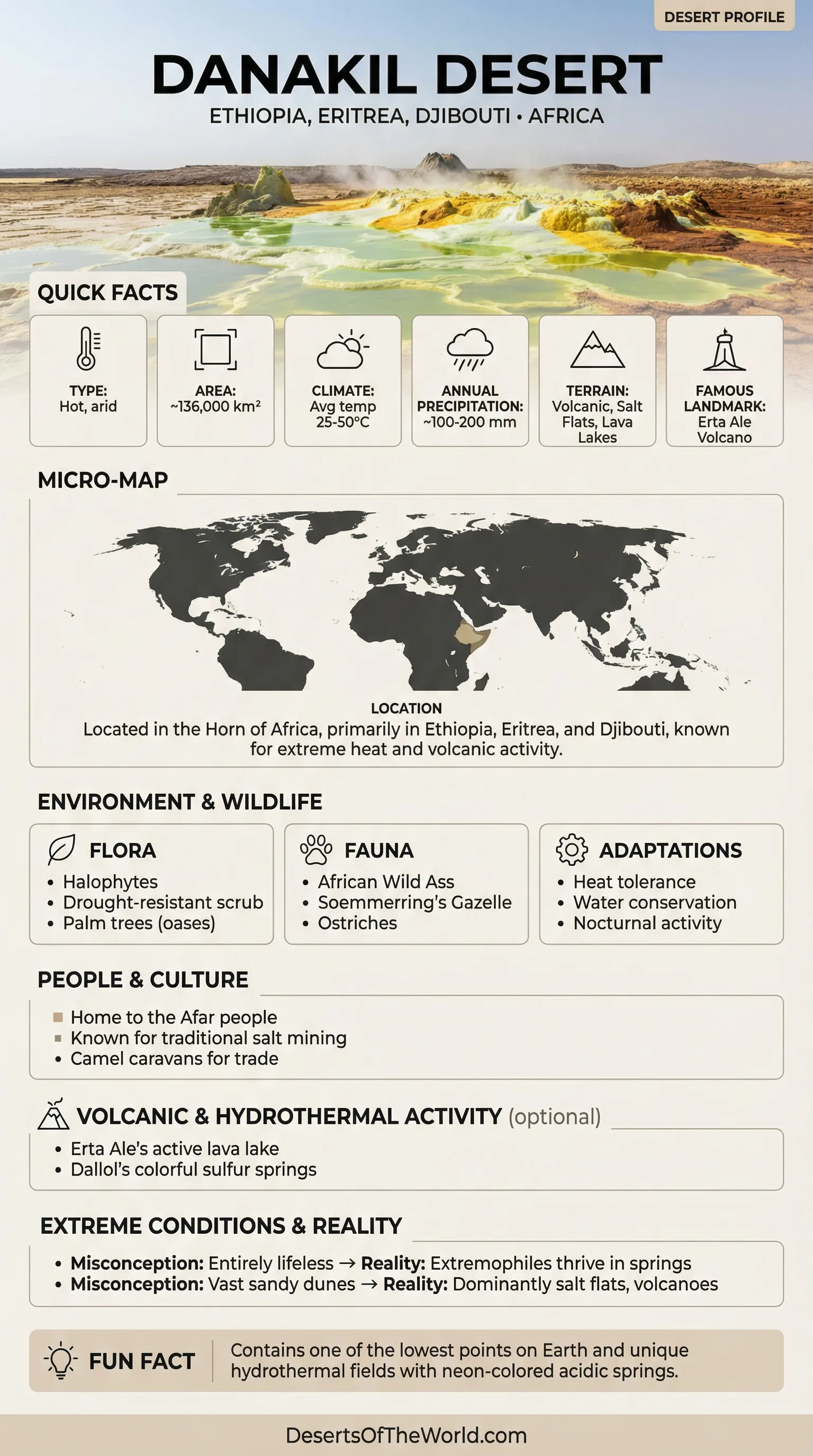 | Danakil | Ethiopia | 34 | 100,000 | Active Volcanoes, Salt Flats, Acid Lakes |