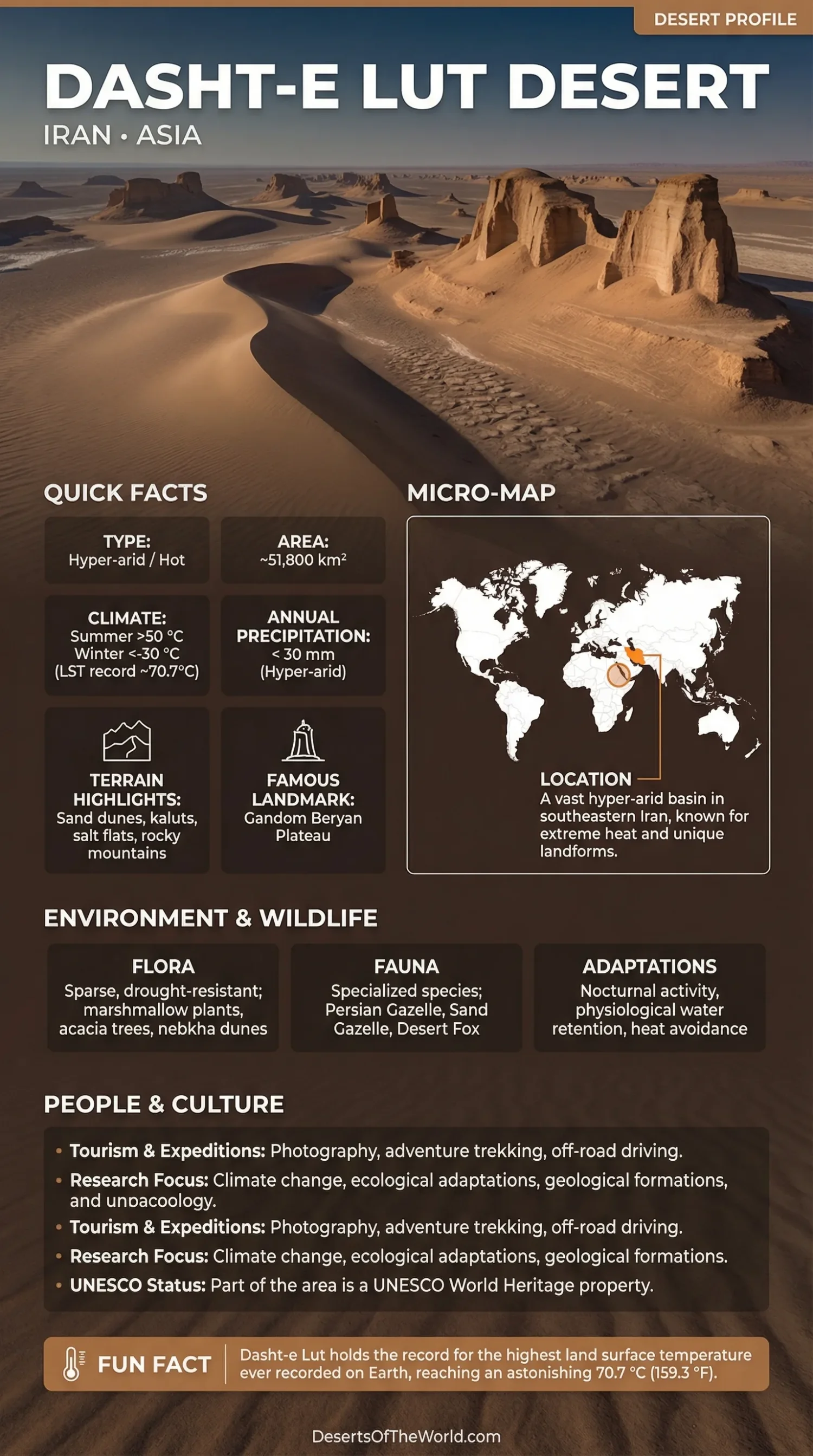 Dasht-e Lut, also known as the Lut Desert, is a vast expanse of uninhabitable land located in southeastern Iran. It spans an area of approximately 51,800 square kilometers, making it one of the largest deserts in the world. Recognized for its extreme conditions, Dasht-e Lut holds the record for the highest ground temperature ever recorded on Earth, reaching an astonishing 70.7 °C (159.3 °F).