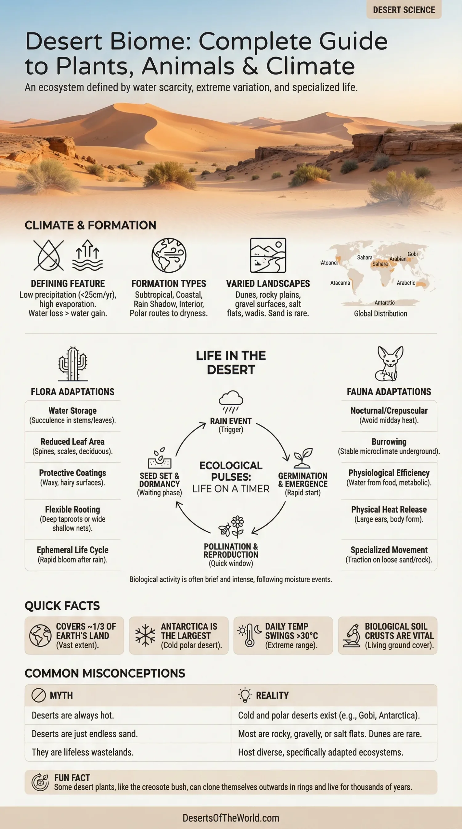 - “Desert means hot.” Not always. Cold deserts are real, and Antarctica is the largest desert on Earth.