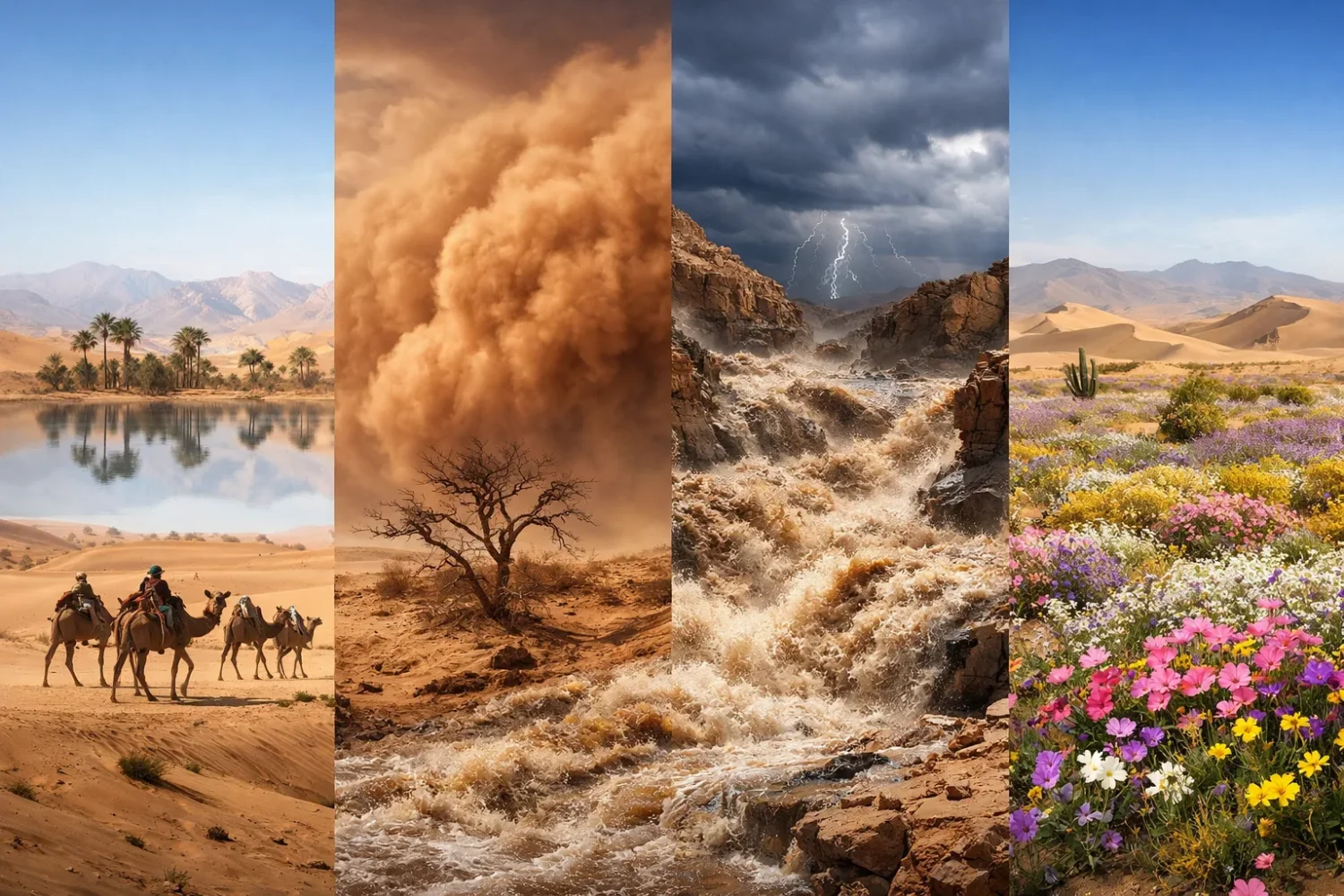 | Desert Region | Mirages | Sandstorms and Dust | Flash Floods | Blooms and Greening |