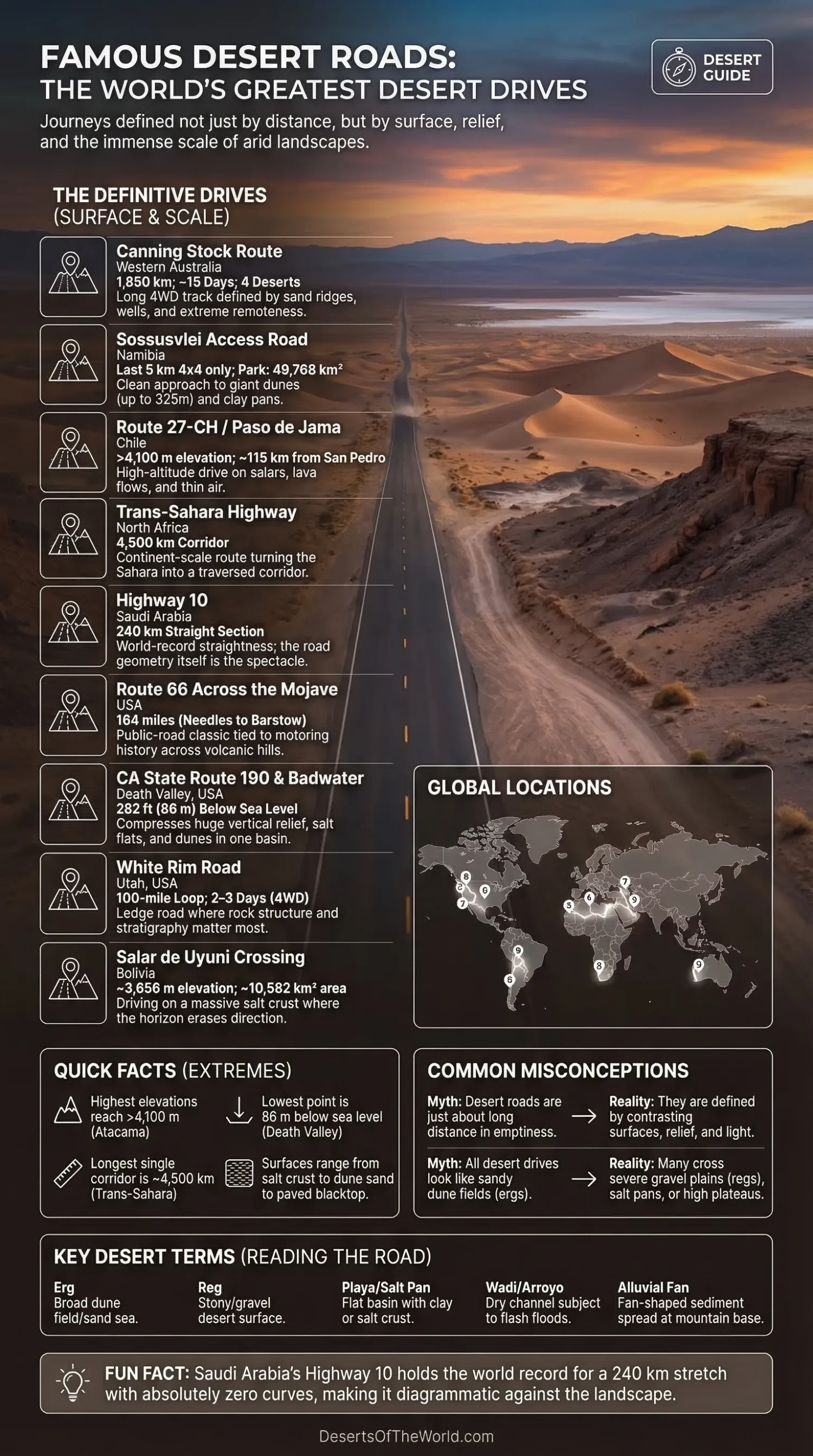 A real desert road is never only about distance. It is about surface, relief, light, drainage, and the way the horizon behaves. On one route, the land is so flat it barely seems to move. On another, a sealed carriageway drops from high mountains into a basin below sea level. Desert roads look simple from far away. Up close, layered they are.