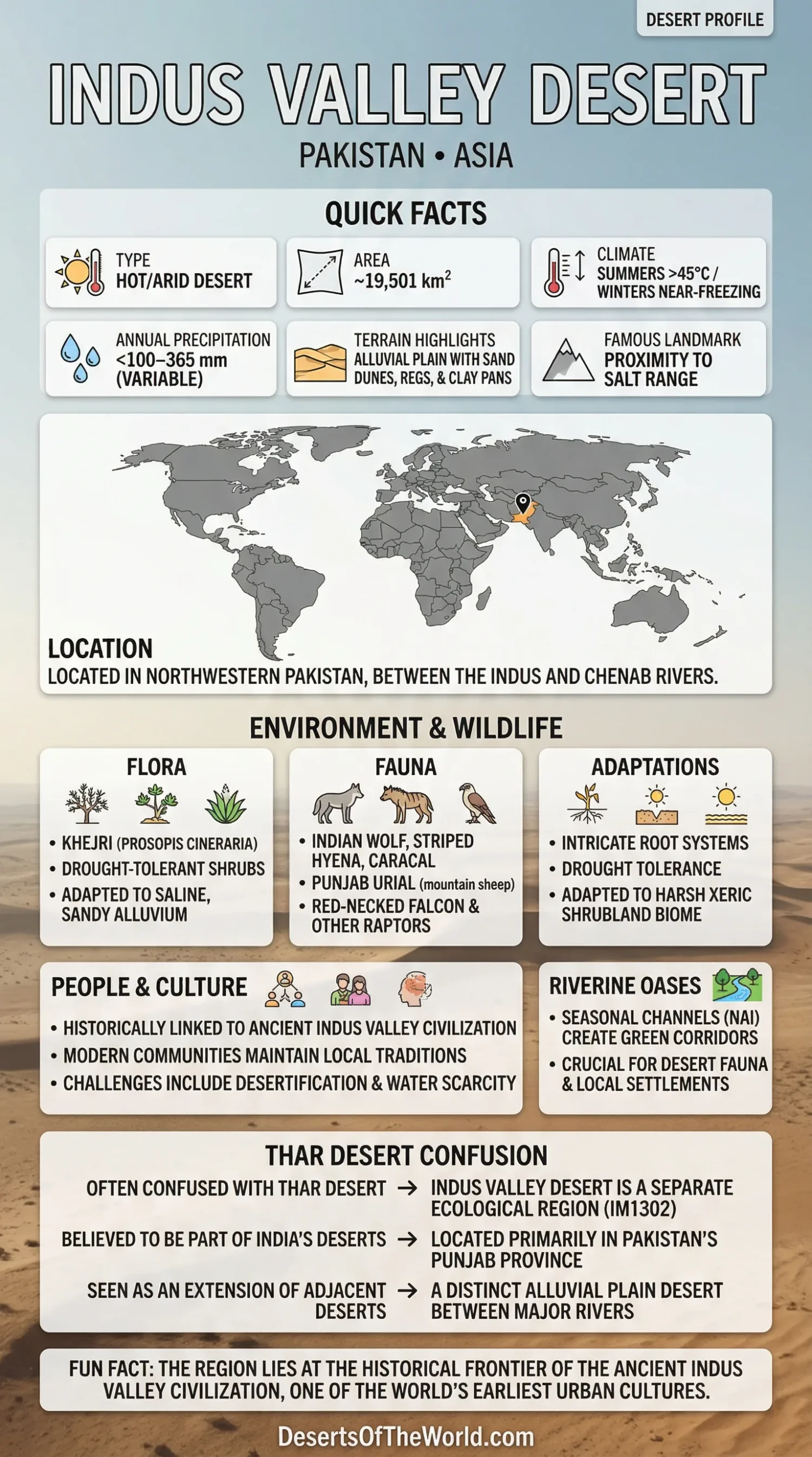 The ecoregion covers about 19,501 square kilometers, making it a compact but distinct desert within the Indus plains.