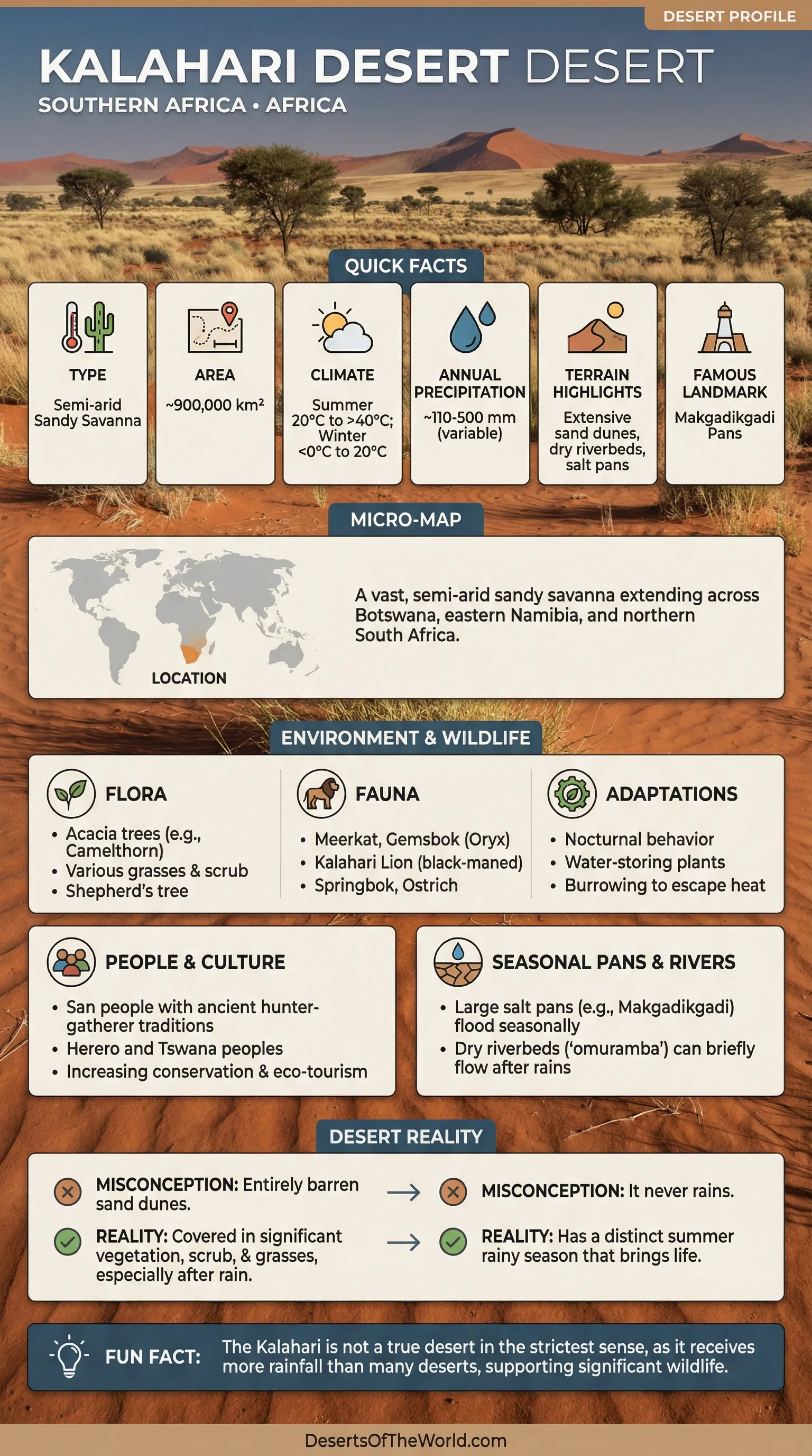 The Kalahari Desert is a large desert system with varied habitats and species. It differs from the common image of a barren desert by supporting plant, animal, and human communities. Conservation efforts help protect its ecosystems for the future.