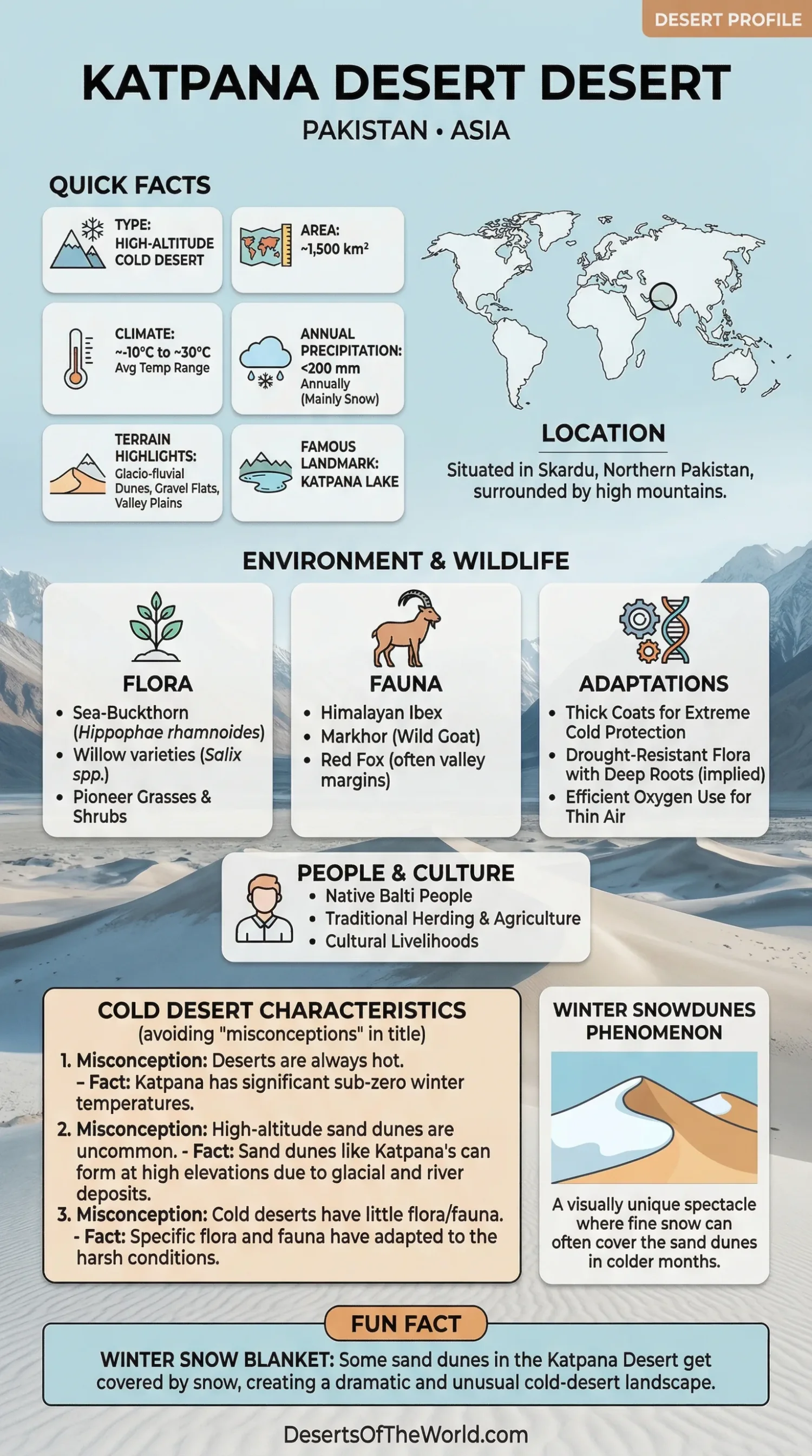 The Katpana Desert, also known as the Cold Desert or Skardu Desert, is located in northern Pakistan within the Gilgit-Baltistan region. It is characterized by high-altitude sand dunes and cold desert conditions. The area has ecological and cultural importance and attracts both researchers and visitors.