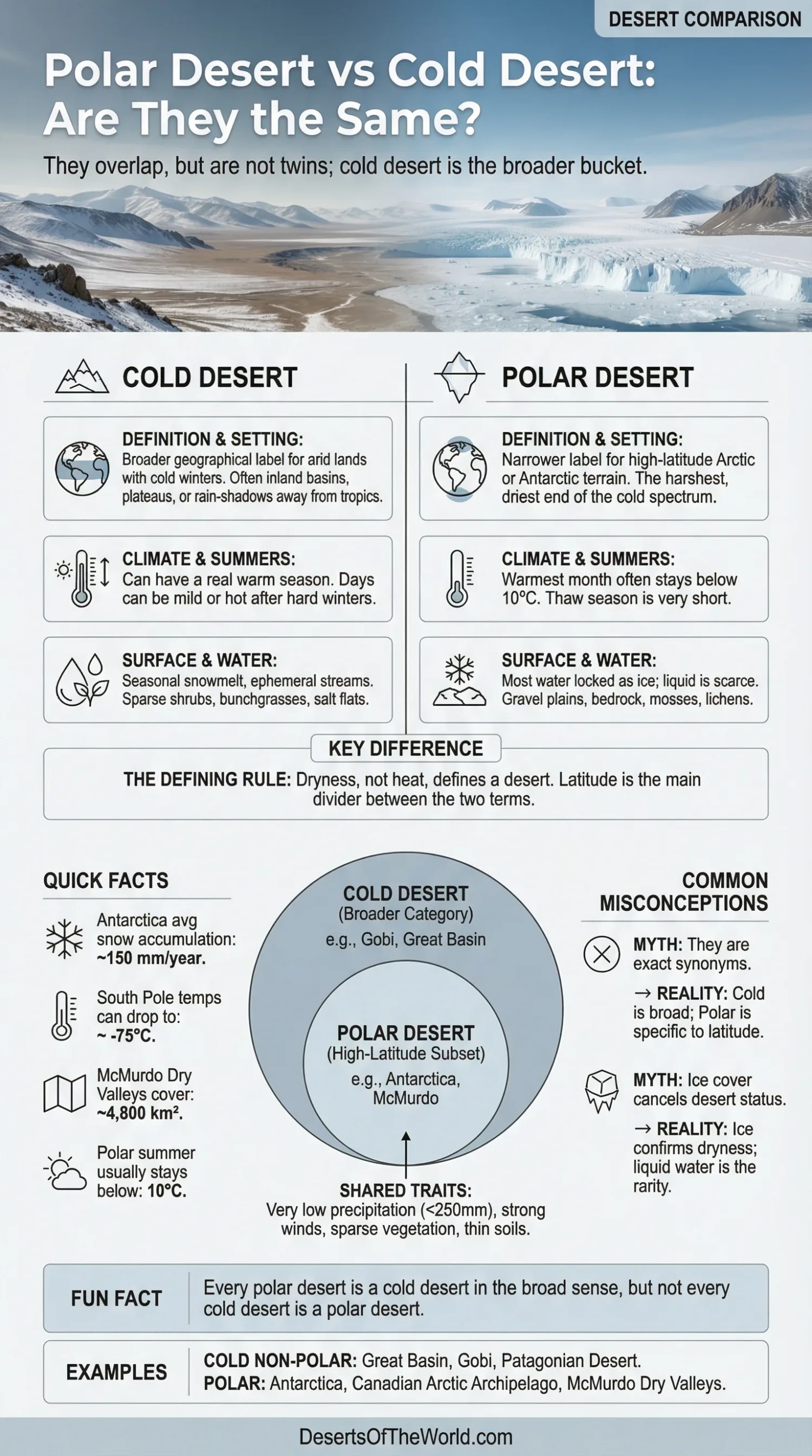 | Examples | Great Basin, Gobi, Patagonian Desert | Antarctica, parts of the Arctic, McMurdo Dry Valleys |