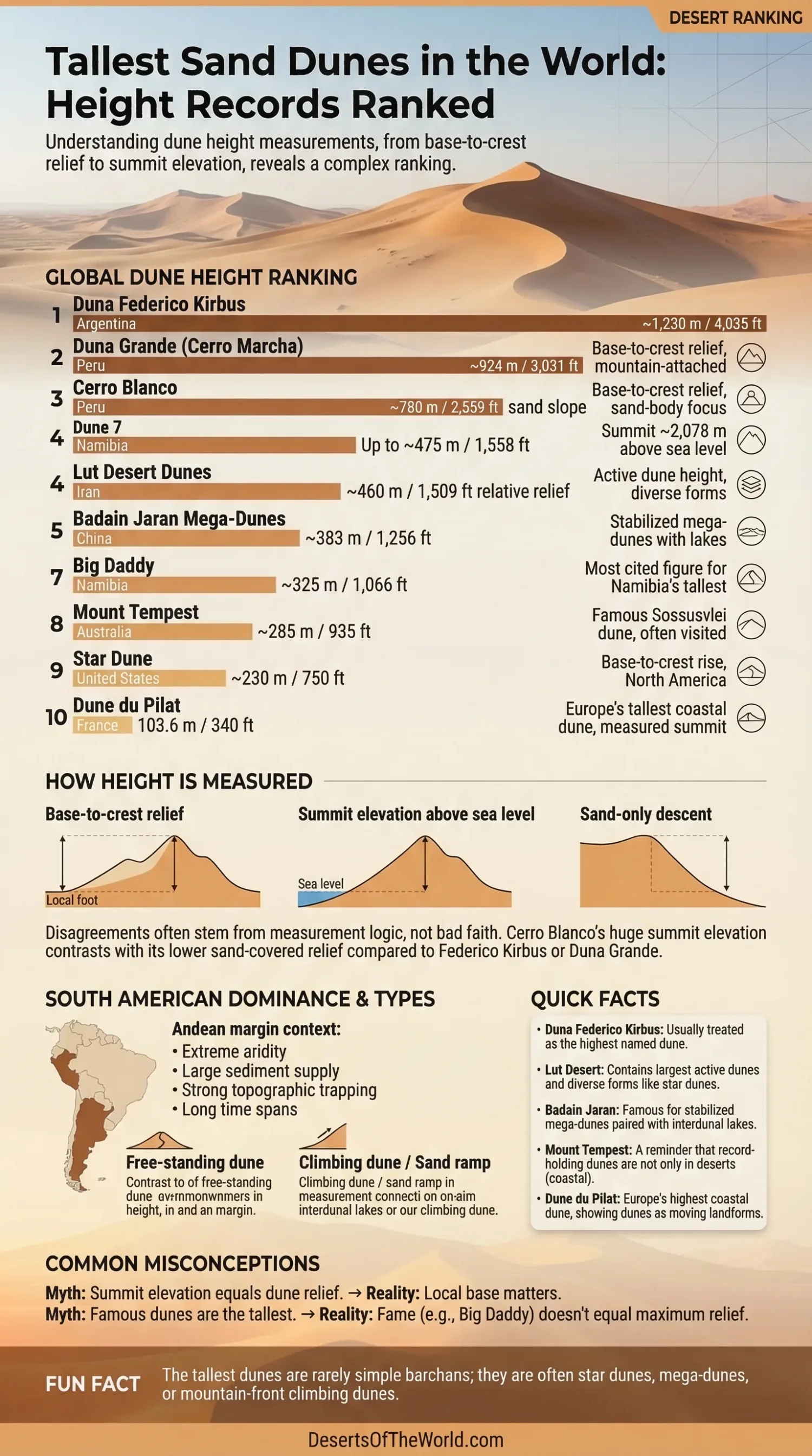 If two dune rankings disagree, the disagreement usually comes from measurement logic, not from bad faith. A dune can be measured in at least three common ways: