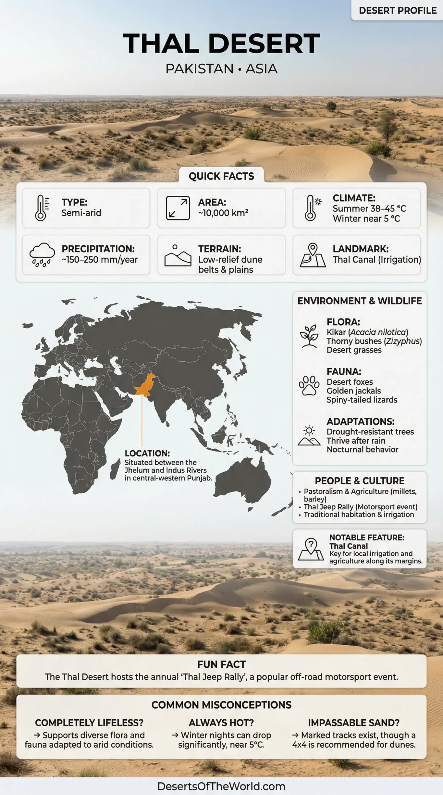 Notable Features: Extensive dune corridors near Mankera and Layyah; inter-dunal saline flats; historic caravan routes linking riverine towns; modern Thal Canal irrigation margins; and the annual Thal Jeep Rally motorsport event on marked off-road stages.